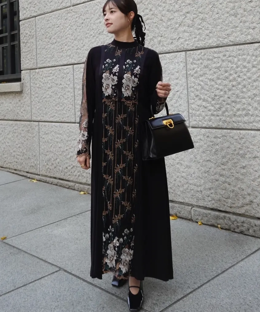 【1サイズ】Floral Lace-Sleeve Classic Dress - black
