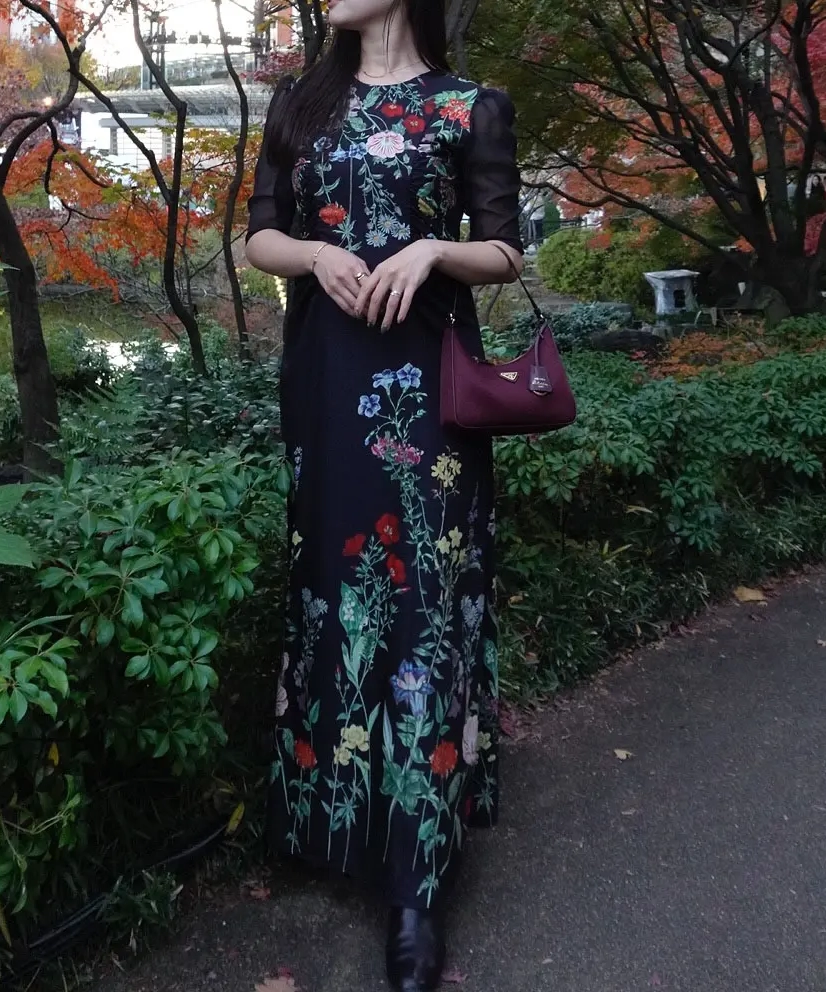 【Sサイズ】配色パピングプチハイネック花柄刺繍ラメレースロング丈ドレスワンピース